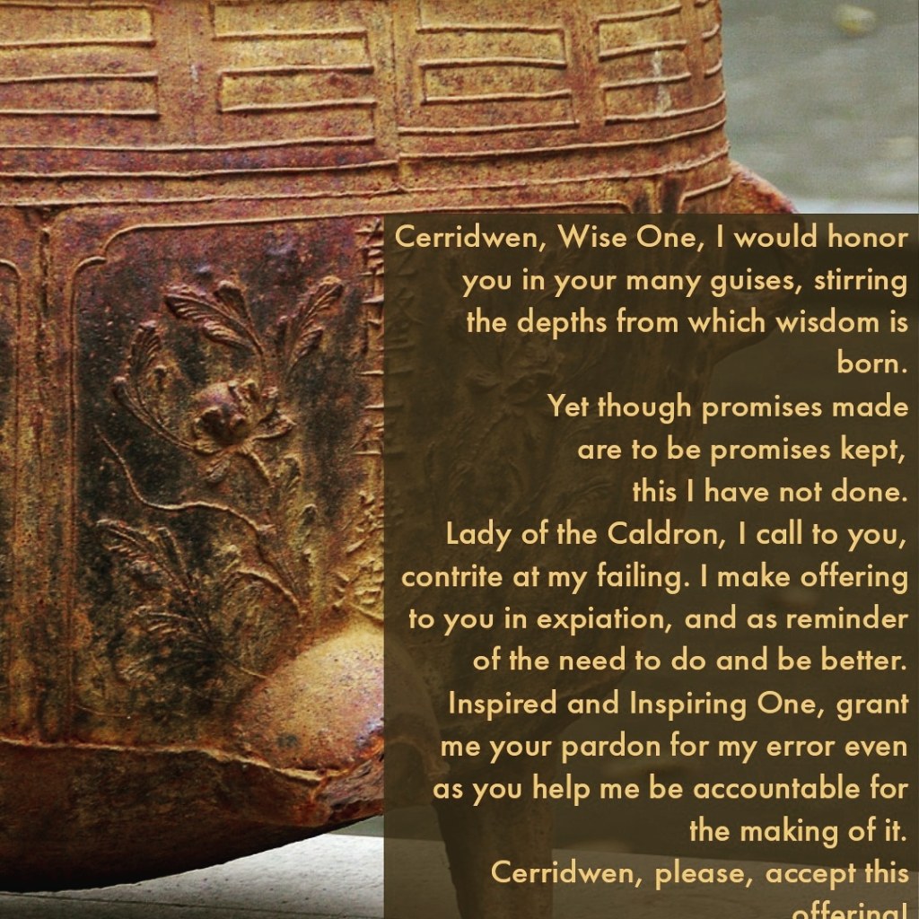 Lady of the Caldron, I call to you, contrite at my failing. I make offering to you in expiation, and as reminder of the need to do and be better.
